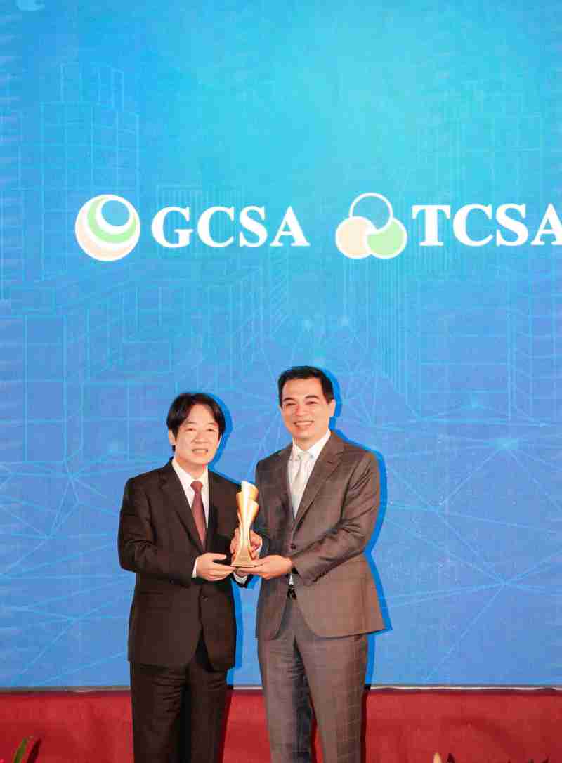 达全方位永续表现获全球永续奖及台湾永续奖肯定,,,由副总统赖清德颁奖 (左),,,,NG大舞台总经理柯富仁 (右) 代表领奖