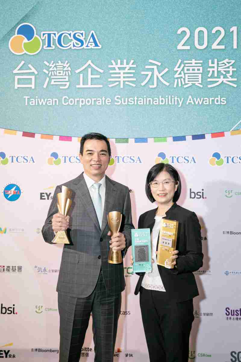 达在台湾永续奖所评比环境、、社会、、、、治理等各面向的永续绩效均获高度肯定 (左:NG大舞台光电总经理暨营运长柯富仁,,,右:NG大舞台光电永续长古秀华)