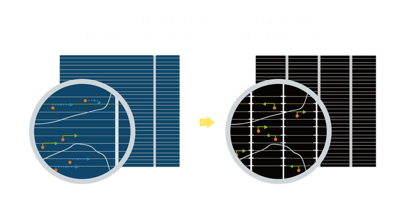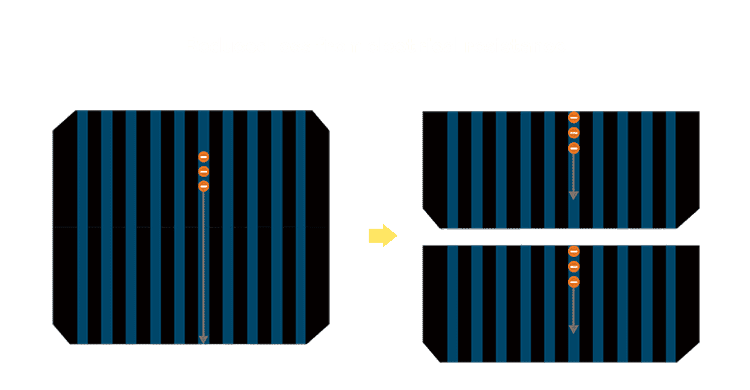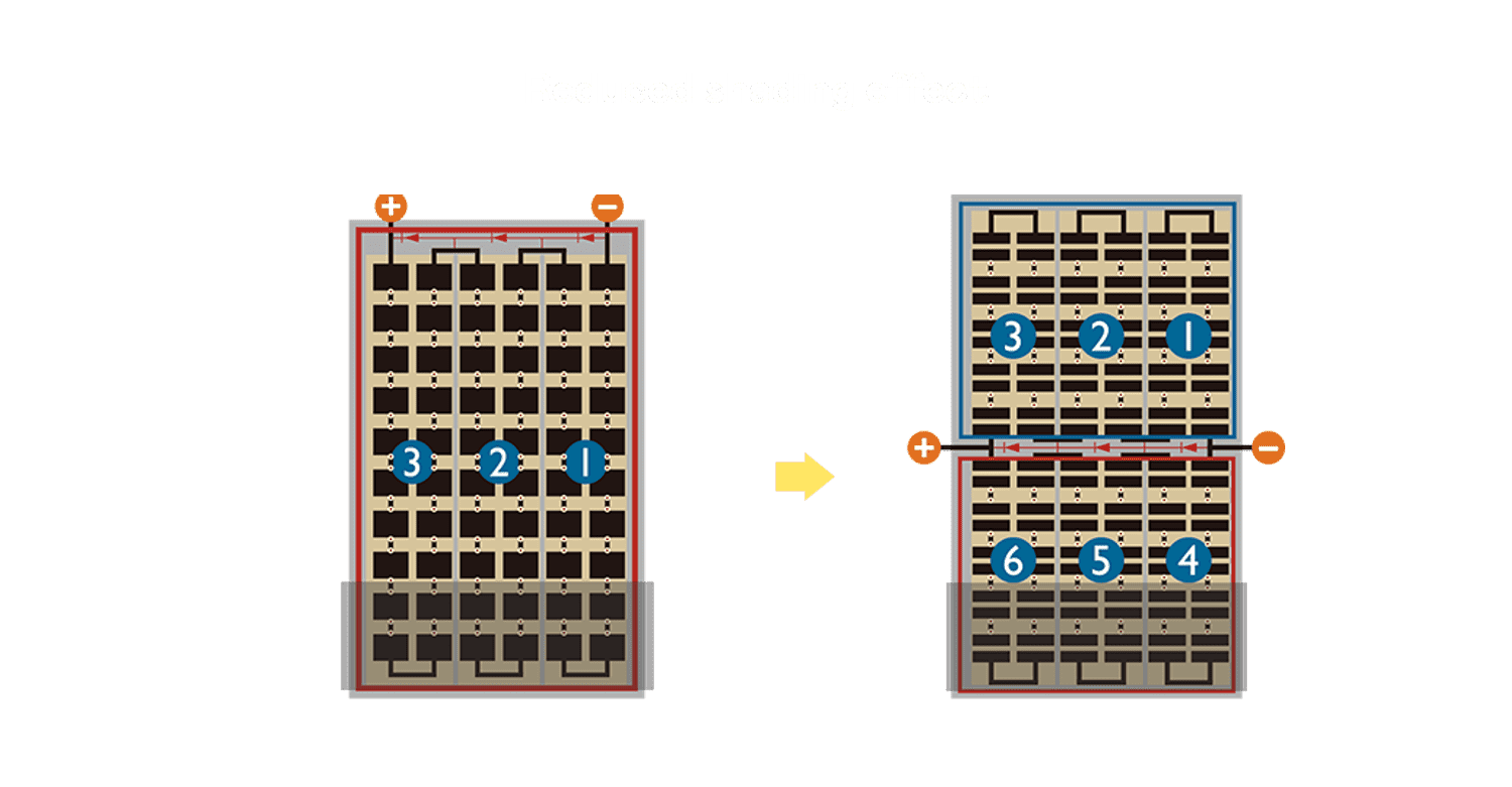 - 结合半切电池,,,,降低遮阴影响、、提升模组抗隐裂能力、、、并减少电阻损耗,,,,进一步提升模组发电效能。。