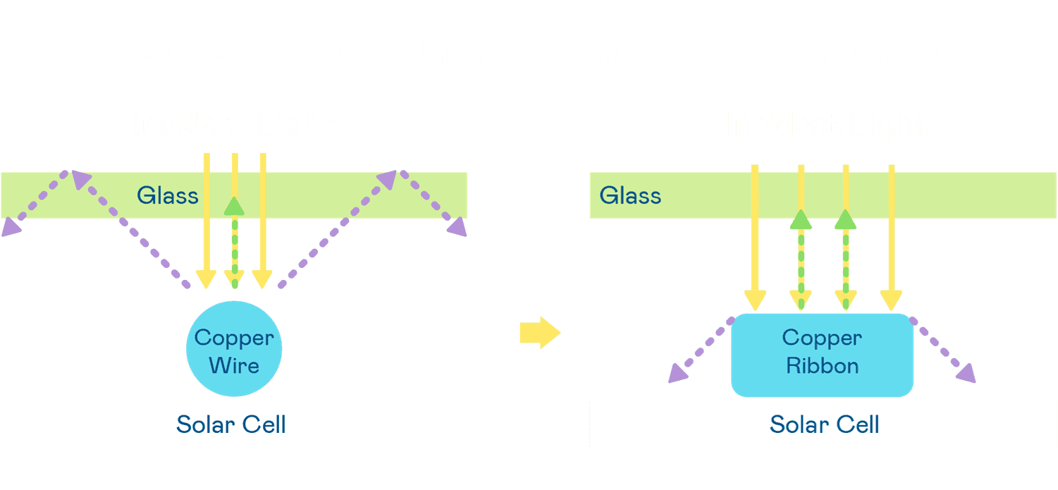 - 电池使用多条铜导线 (Copper wire) 于电池片上形成较短的电流路径,,,,提高电流收集效率,,采用圆形设计的铜导线较传统扁平式的铜焊带 (Ribbon),,,,可增加入射至电池的光线量。。。。